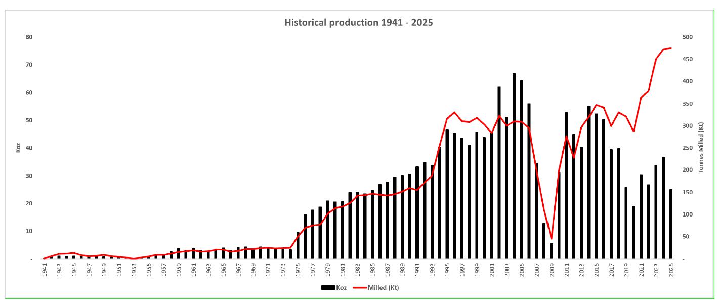 | Arran | 1,455,000 | 1975 | Narrow quartz-pyrite reef in talcose schist. Highly variable grades. | ||||||