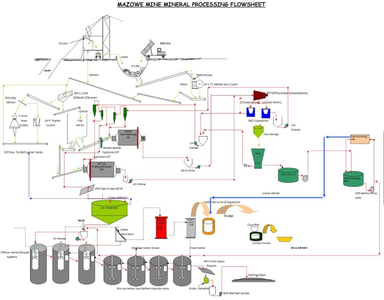 A gold and silver doré is produced for sale to the Zimbabwean government nominated agent, Fidelity. Gold generally averages 87% by weight. The product is transported by a private professional security company. Fawcetts Security, via armoured car to airport, then airlifted to Harare. Then transported by armoured car to Fidelity, a government owned refining facility via the Motapa Investment Fund (sovereign fund). Gold and silver is valued at spot pricing under the RTGS system on receipt of the doré with Fidelity stipulating allowances for refining charges (US$0.65/oz Au) and government royalty (5%).